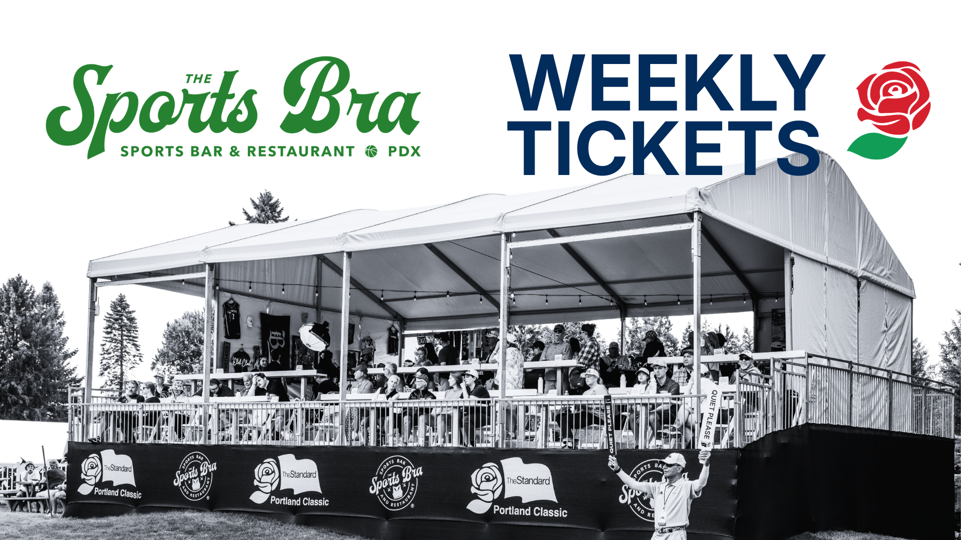 Ticket allows for weekly event entrance and access to the all-new, Sports Bra pop up on hole 15, overlooking the green, which includes prime golf viewing in the comfort of shade, 1 complimentary drink, & no-host bar.